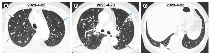 Ein 52-jähriger Patient wird mit Fieber, Nachtschweiß und Husten mit schwarzem, zähem Auswurf in einer chinesischen Klinik stationär aufgenommen. Die Symptome hatten bereits vier Wochen zuvor begonnen. Er hatte zunächst eine symptomatische Therapie mit Ibuprofen begonnen, die kurzfristig zu einer Linderung führte. Bei Beschwerdepersistenz wurde zwei Wochen später eine Thorax-CT durchgeführt, die multiple Läsionen in beiden Lungen zeigte. Es erfolgten ambulante Sputumkulturen, in denen keine pathogenen Bakterien nachgewiesen wurden. Eine antiinfektive Therapie mit Levofloxacin führte zu keiner Besserung.